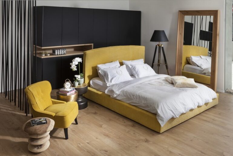 חדר שינה מעוצב עם נגיעות חרדל