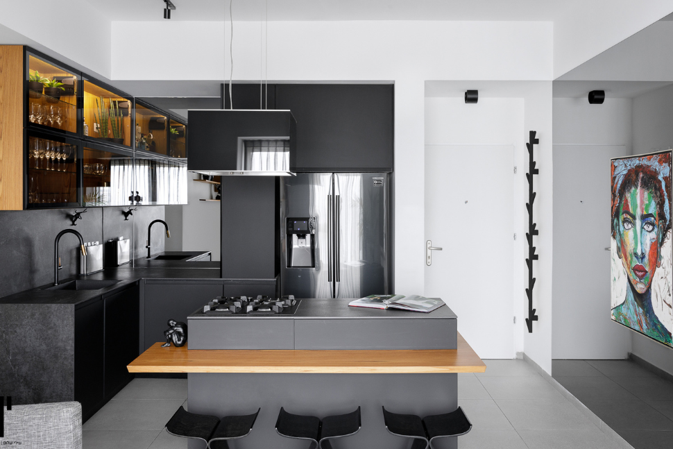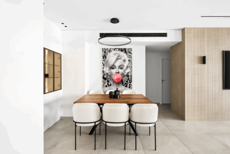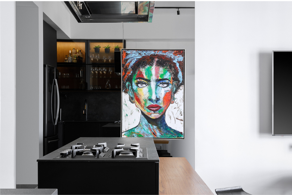 הדיירים, בני זוג אספני יין, ביקשו יצירה שתשקף את אהבתם – התוצאה: דמות אישה עם כוס יין, ביצירת קיר ענקית מקרמיקה ! פרי יצירתה של האומנית הרב תחומית והמוכשרת, אפרת אילן, שנעשתה בשיתוף עם המעצבת. באותו חלל, בקיר סמוך, נוספה גם משרביה בדמות האישה עם היין, שילוב בין עיצוב, פיסול וסיפור חיים.
