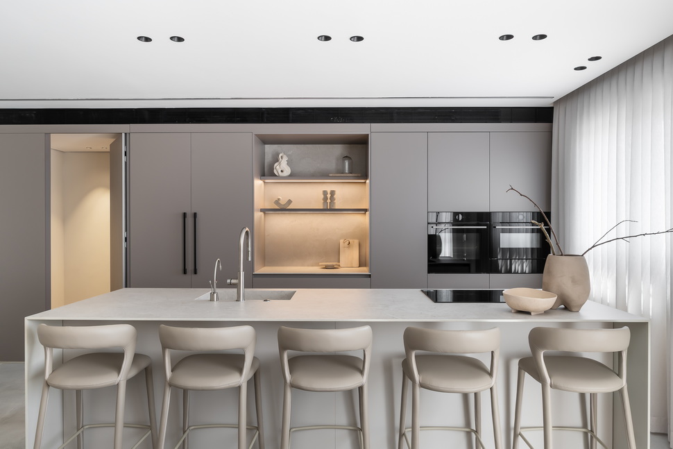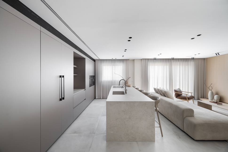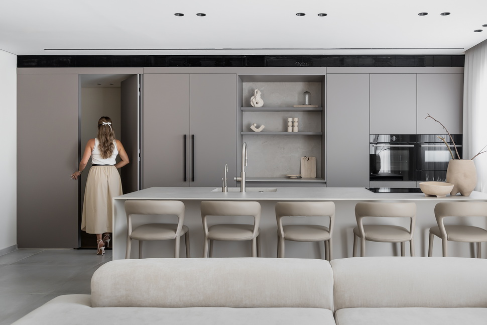 המטבח תוכנן כך שעיקר העבודה מתבצעת סביב האי המרכזי, המאפשר קשר ישיר עם פינת האוכל והסלון ויוצר אינטראקציה יומיומית בין בני הבית. מאחוריו נבנתה חזית של ארונות גבוהים הכוללת מזווה, מכשירי חשמל אינטגרליים ופינת קפה עם מידוף ותאורה רכה. מעבר לפונקציה, המטבח משמש גם כאלמנט תכנוני המפריד בין החלל הציבורי למבואת חדרי השינה – באמצעות דלת סתרים המשולבת בקו הארונות הגבוהים.