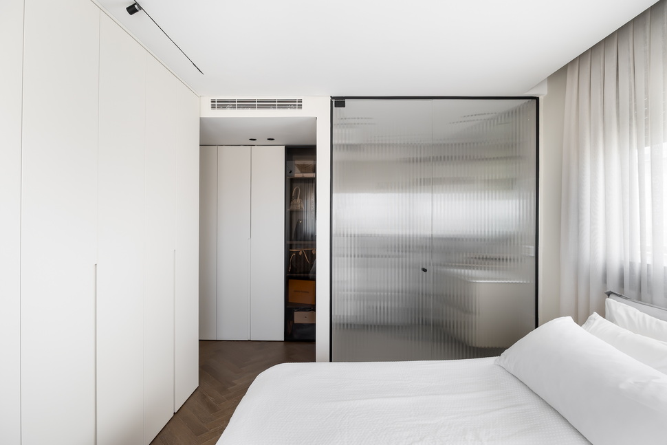 גם חדר השינה של ההורים עבר שינוי מהותי לעומת תכנית הקבלן. במקום חדר סטנדרטי, נוצרה סוויטת הורים מרווחת הכוללת חדר רחצה פרטי וקיר זכוכית גלינה, המכניס אור טבעי נוסף ומעצים את תחושת המרחב. בסוויטה שולבו פרטי נגרות רבים לפתרונות אחסון, כולם בקו נקי שאינו מעמיס על החלל. את הטלוויזיה בחרה נופר למקם בתקרה באמצעות מנגנון מעלית נסתר – פתרון ששומר על חזית שקטה ואלגנטית גם בחדר השינה.