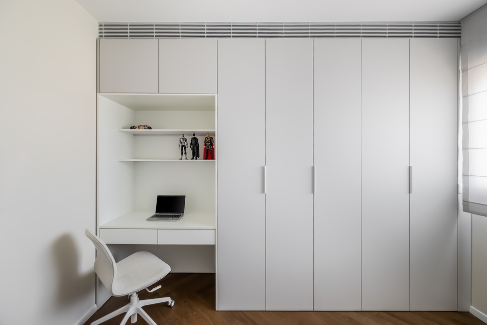 בחדרי הילדים תוכננה נגרות בקווים על־זמניים, עם דגש על פונקציונליות, סדר ויכולת התאמה לשנים הבאות. שילוב של טקסטיל רך ותאורה מדויקת יוצר בחדרים אווירה רגועה ואסתטיקה שקטה, שמאפשרת לילדים לגדול בתוך חלל שאינו תלוי בטרנדים חולפים.