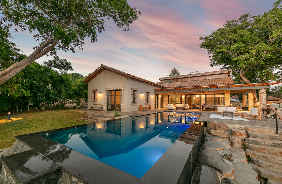 הבית כולל תקרת עץ משופעת המיתמרת לגובה של 5.5 מטרים ופתחים גדולים ומיוחדים, כך שהעץ בפנים מתכתב עם הסגנון השיקי מחוספס של הבית ובחוץ אלומיניום, עם אקוסטיקה מעולה ובידוד שמביא לחסכון של עשרות אחוזים בחימום וקירור הבית. הרצפה מצופה באבנים טבעיות בגדלים, צבעים וגימורים שונים, הממשיכים גם בחוץ ובבריכה. העיצוב בולט בפרטים המיוחדים והלא שגרתיים שלו, והמטבח מצוי במרכז החלל הציבורי, מהווה עמדת תצפית שמנצחת על כל הבית.