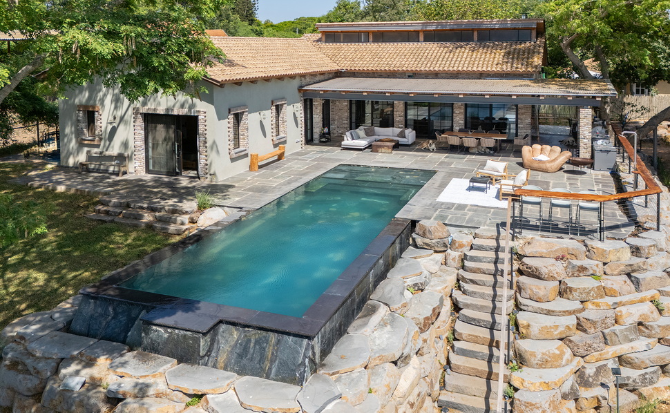 המשטח החיצוני של הבית רוצף באבנים מסותתות עתיקות, המייצרות הפרדה מוחלטת בין החוץ לפנים. החזית חופתה בלבנים טבעיות, והדלת עשויה פלדת קורטן בגימור חלוד, עם פרסת סוסים מרותכת לידית. עם פתיחת הדלת, נחשף החלל הציבורי הגדול: המטבח, פינת האוכל, הסלון, וממנו נשקפים הבריכה ומשק הסוסים.