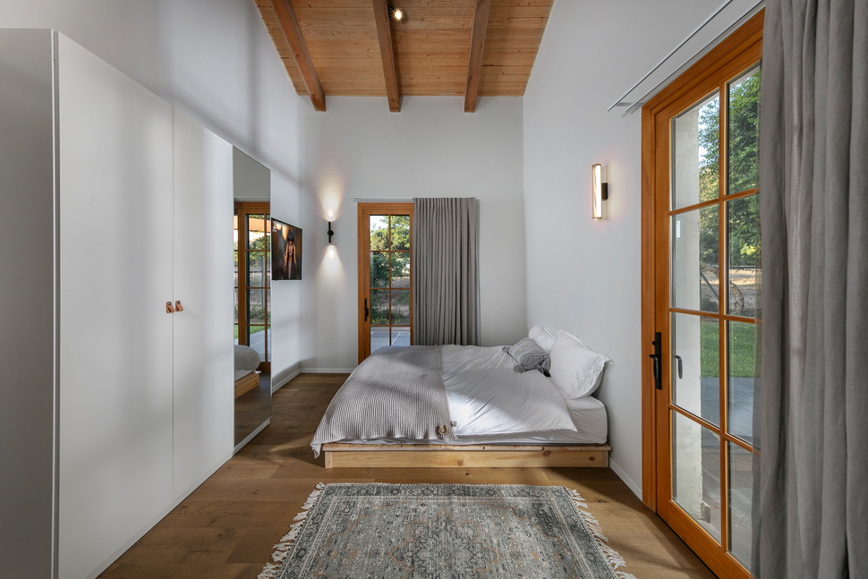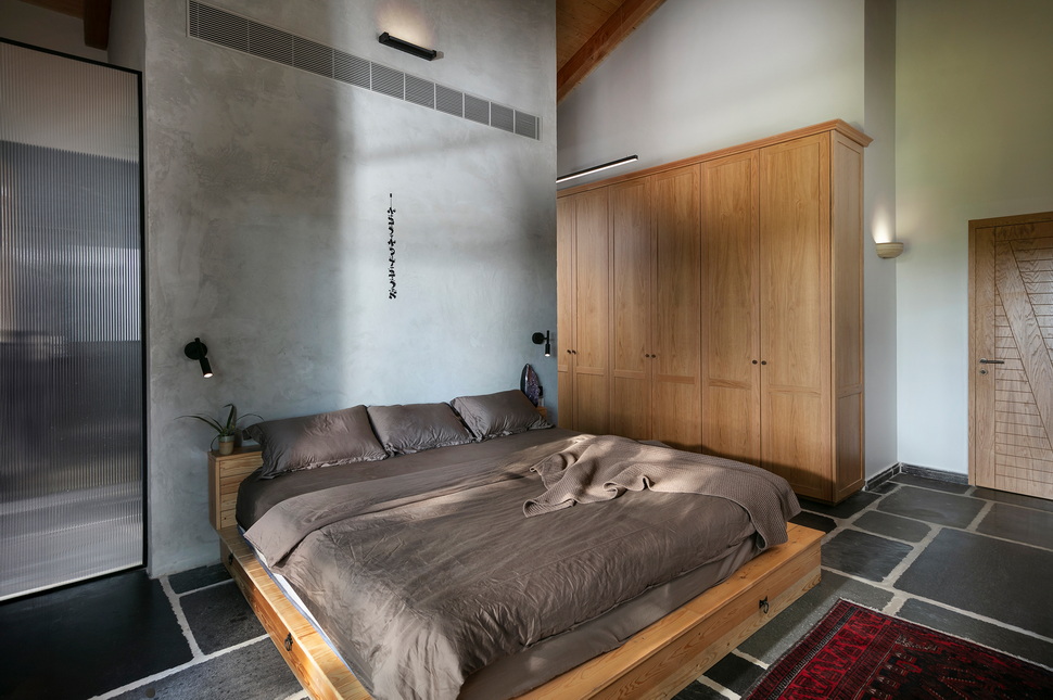 לכל אחד מארבעת הילדים תכננה סוויטה פרטית עם חדר רחצה, יחידת ארונות ויציאה לחצר פרטית מנותקת מהחצר הראשית. מסטר השינה ממוקם בקצה המסדרון תחת תקרת קורות עץ גבוהה, וכולל אזור שינה מופרד מחדר הרחצה בקיר מחופה בטקסטורת בטון עוצמתית. חדר הרחצה כולל שתי כניסות, עם דלתות ברזל וזכוכית גלינה, ומערכות ריצוף ואביזרים המדגישים את הקווים הטבעיים והעיצוב הייחודי של הבית.