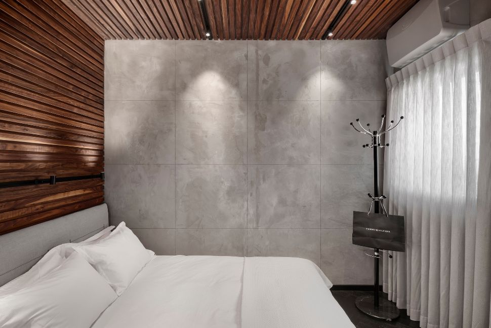 חדר שינה קטן עם קיר סרגלי עץ אופקיים לצד קיר בטון