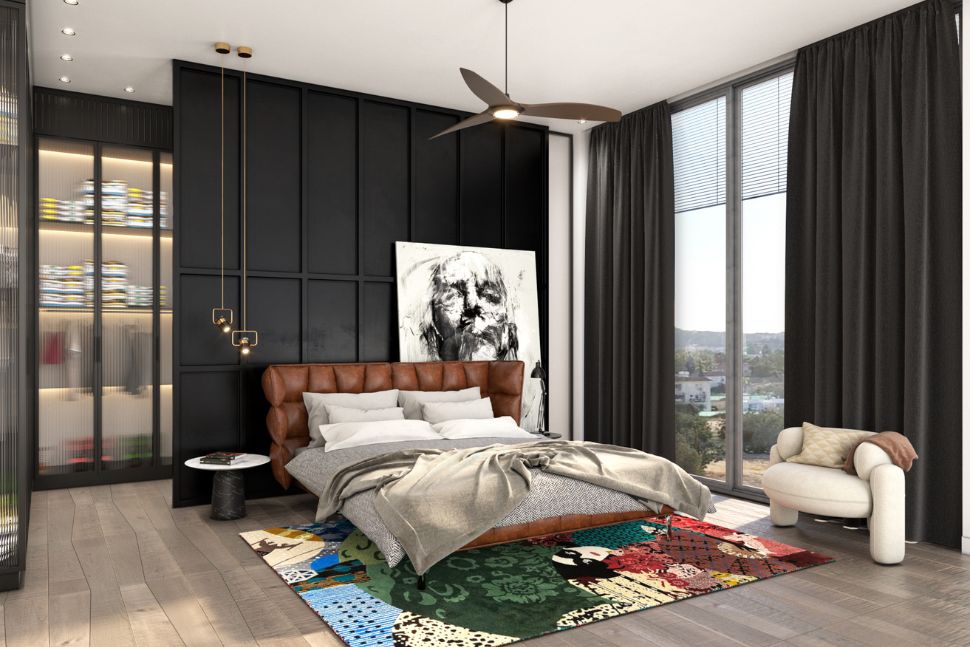 מאוד מקובל לבחור קיר אחד בסלון ולעצב אותו בהדגשה. אז למה לא בחדר שינה?  קיר אחד מעוצב בקווים גאומטריים ישרים ואלכסוניים, ביניהם  משולבים גופי תאורה נסתרים עשה את חדר השינה. להשלמת העיצוב נוספו גופי תאורה שחורים שבולטים על גוון הקיר הלבן.