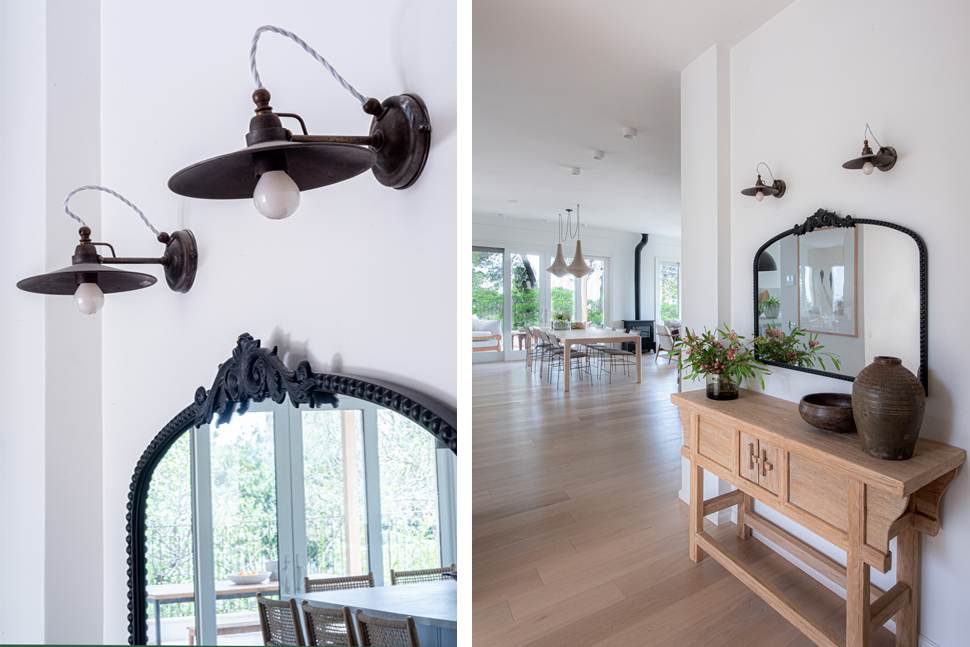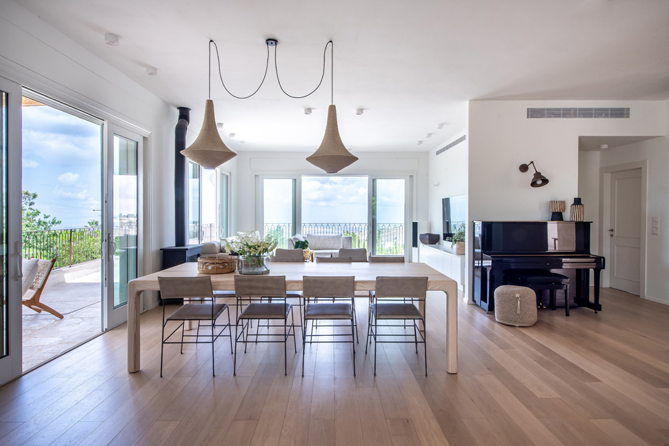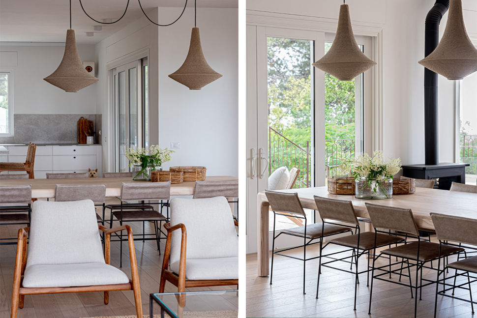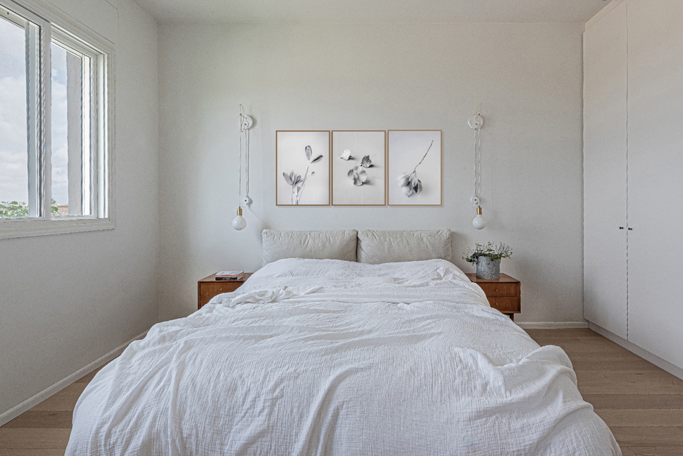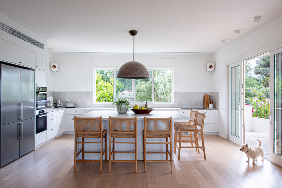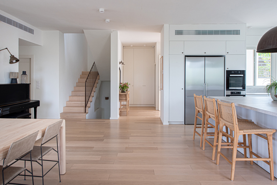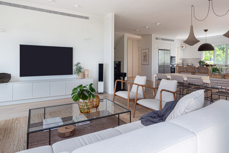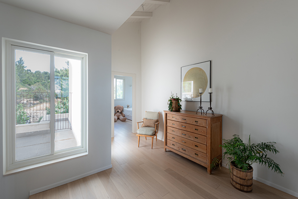 על עיצוב הפנים והסטיילינג אמונה אירה שריג, שיצרה חללים מאוזנים, רכים ונעימים לעין, בגישה שקטה ומדויקת. הקונספט העיצובי התבסס על שימוש במעט חומרים והרבה כוונה: אווירה רגועה, על-זמנית, כזו שאינה נגררת אחר טרנדים. הפ palette נעה בין לבן שבור, חול, אלון טבעי וברזל בגימור חלודה. הרצפה כולה חופתה בפרקט תלת שכבתי בגוון אלון בהיר, והמטבח — לב הבית — תוכנן בקווים נקיים עם אי גדול, משטחים בהירים ונגרות בגוון מתואם. הידיות, הגימורים ופרטי הריהוט כולם נבחרו בקפידה, עם עין רגישה לחומר, קנה מידה ושקט ויזואלי.