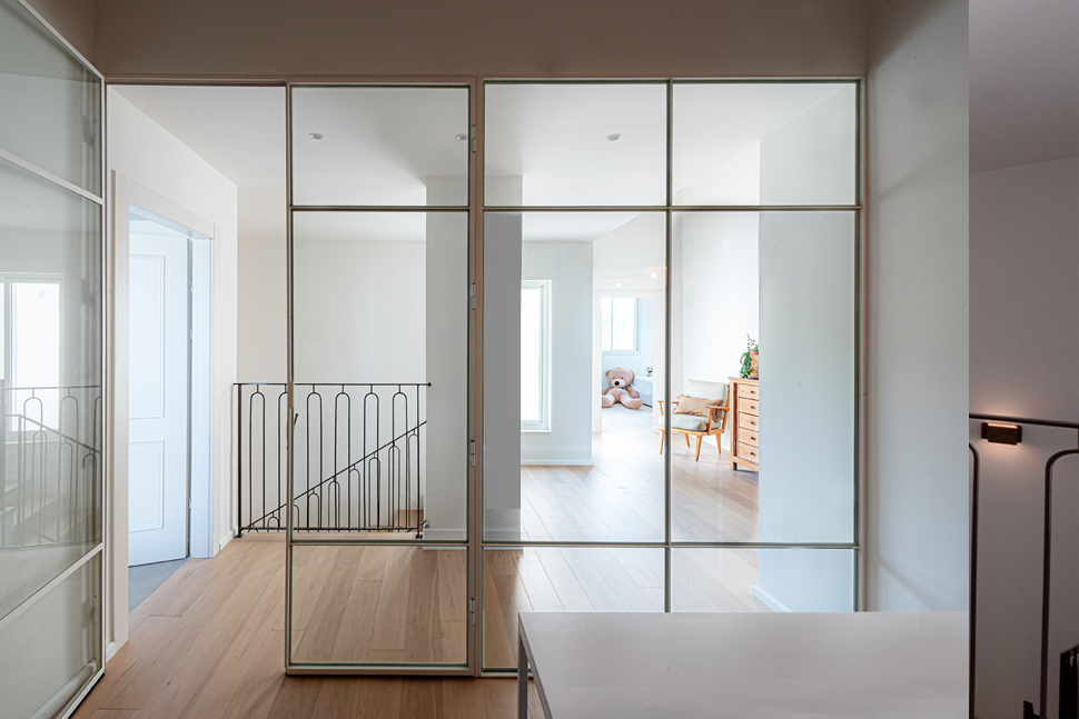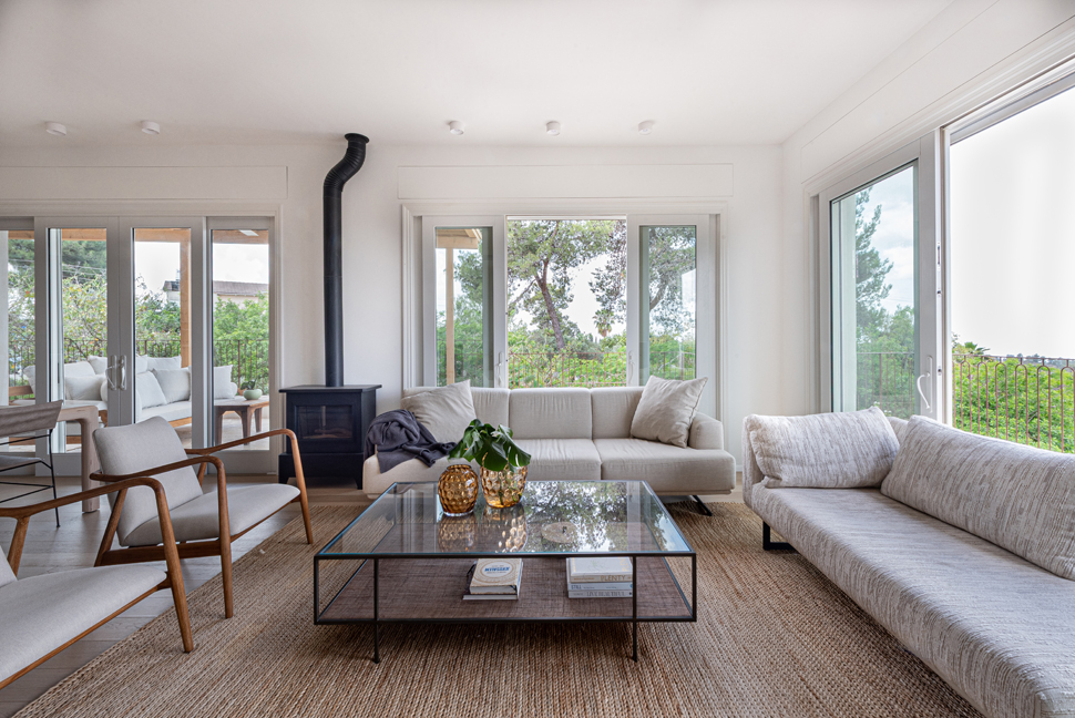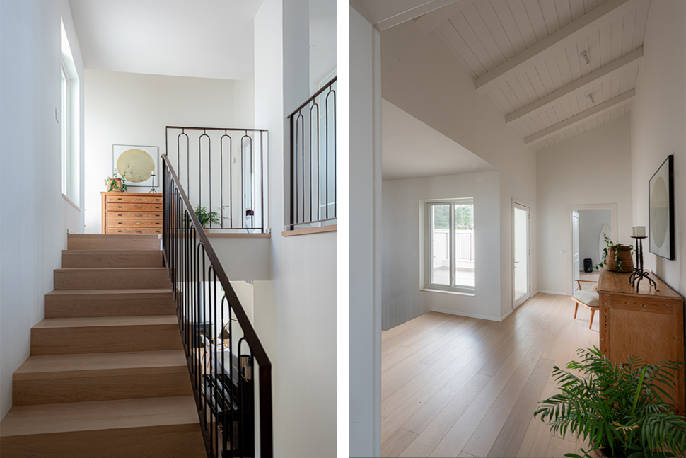 הפרטים בבית מדויקים עד הקצה: מדרגות הבית בוצעו מעץ תואם לפרקט, עם מעקה ברזל דקיק בגימור חלודה טבעית. דלתות הפנים, החלונות ודלתות חדר העבודה — כולם בגימור ברזל וזכוכית, שממשיכים את השפה. שירותי האורחים חופו באריחי עבודת יד בגוון בהיר, חדרי הרחצה באריחי גרניט פורצלן חוליים, ובארונות עץ אלון עדינים. הסלון מרוהט בבדים בגוון לבן שבור, שטיח מחצלת טבעי ושולחן משולב ברזל וזכוכית. קמין ברזל שחור מסורתי ממוקם בלב החלל, כראוי לבית על ההר.