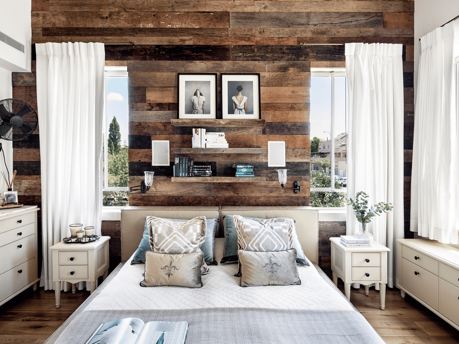 קיר בחדר שינה עשוי כולו מקרשים משומשים