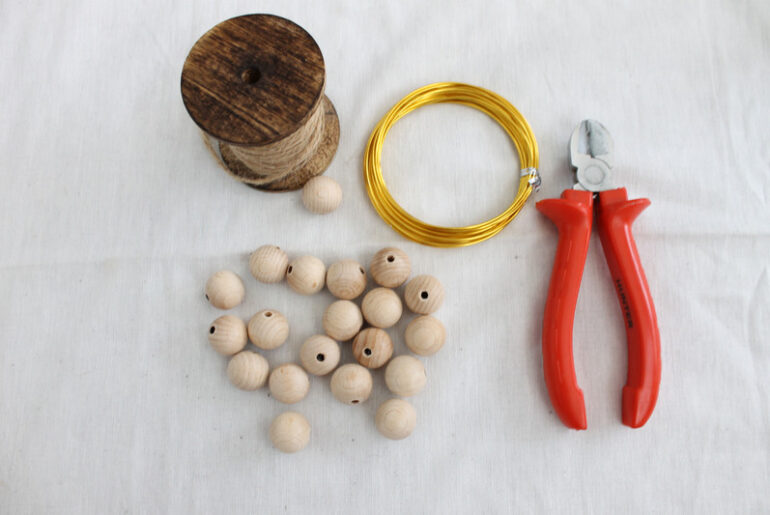 השחילו את חרוזי העץ על חוט הברזל, וצרו עיגול. חיתכו באמצעות הקאטר את קצות חוט הברזל, לפפו וסגרו היטב.