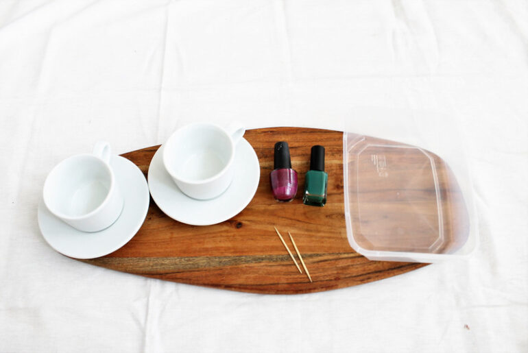מלאו את קופסת הפלסטיק במים חמים, וטפטפו לתוכה לק בגוון שבחרתם. ערבבו את הלק במים באמצעות הקיסם.