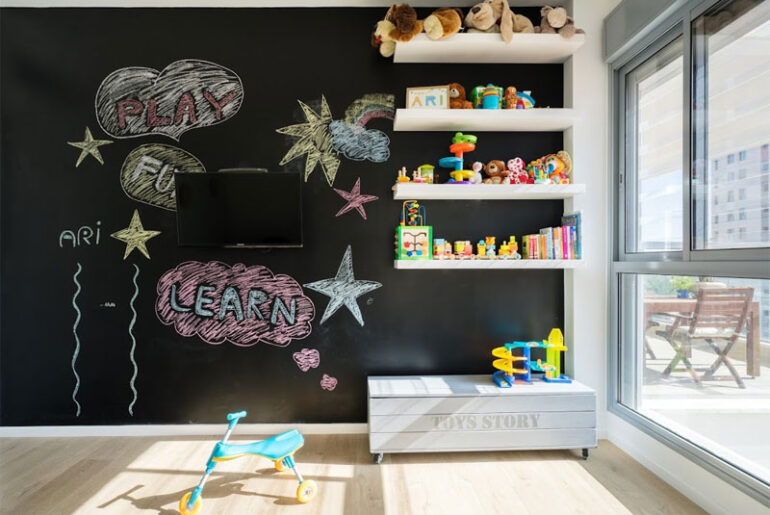 הפצעתו של לוח הגיר הייתה כנראה אות לבאות. מה שהתחיל כרוח שובבה ורעננה בפינות קטנות של המטבח בהן ניתן לרשום הודעות, או בארונות חדרי הילדים, בהם נותנים דרור ליצירתיות של הקטנים, המשיך לקירות של חדרי ילדים ומשחקים. "החדר שעיצבתי הוא חדר דינמי עם הרבה מאוד משחקים ומבחר גדול של צבעים", אומר מעצב הפנים ערן נעים מסטודיו EN design. "קיר גיר שחור מרכזי מכניס צבע לא אופייני לחדר ילדים, אך משמש כרקע מצוין לכל הצבעוניות של המשחקים וככזה מייצר סדר בעין". בנוסף, הוא מעודד הבעת יצירתיות של הילד ומסתיר היטב את מסך הטלוויזיה.