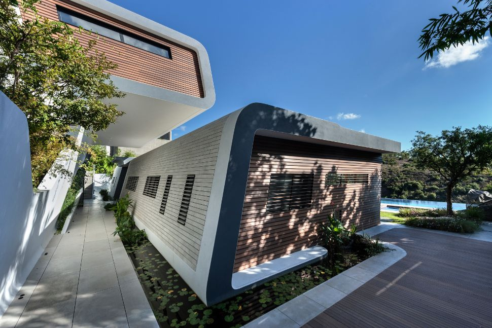 למים זורמים מסביב לבית, מובן כפול שמסתתר במילה אחת – הצפה. באמצעות תכנון מקדים של תעלות מים המקיפות את הבית, המבנה נראה כצף על פני המים. ובמובן השני, נוכחות המים בכל אחד מחזיתות הבית משפיע גם על הפנים. צליל פכפוך המים, הרעננות שלהם, ותנועת הזרימה המתמדת מציפים את פנים הבית באנרגיות חיוביות.