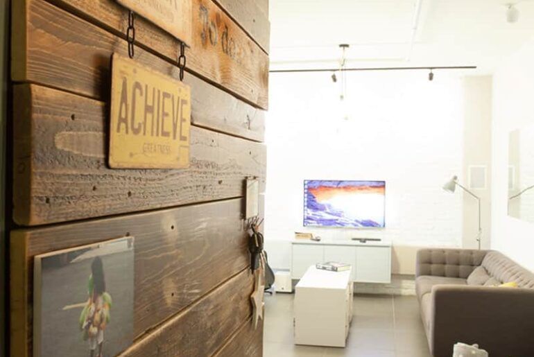 במהלך העבודה כאן נאספו משטחי עץ ממשטחי פריקה שהגיעו לאתר הבנייה. המשטחים פורקו, שויפו ונצבעו בגווני לכה שונים, והוספו כתובות בעזרת שבלונות (30-10 שקלים) ודקורציות (50-30 שקלים). העצים חוברו לקיר על ידי בעל הדירה באמצעות ברגים, נוספה מנורת קיר מתכווננת (300 שקלים), וכך נוצר קיר מחופה עצים ממוחזרים פעיל ושימושי, שבו אפשר להשאיר הודעות ולהניח מפתחות ושאר חפצים.