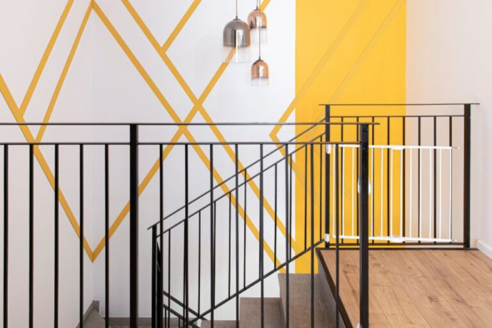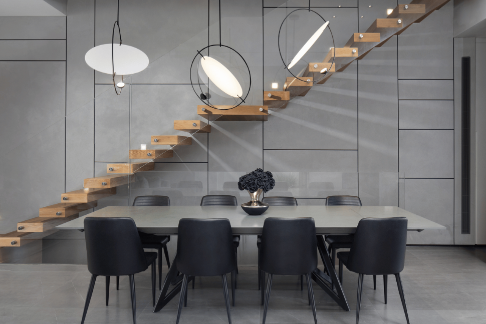 קיר גאומטרי, עשוי כולו מלבנים וריבועים בגדלים שונים, חלקו זה רק קיר וחלק אחר שלו היא חזית ארון אחסון. האם הקיר הוא זה שהכתיב את שוס העיצוב ? לא. גם לא השולחן המבלני המקביל, ואפילו לא גופי התאורה המעוגלים. מה שעשה את המיוחד בפינת האוכל, הוא גרם מדרגות העץ שחוצה בקו אלכסוני את הקיר ומעורר עניין בפינת אוכל אפורה.