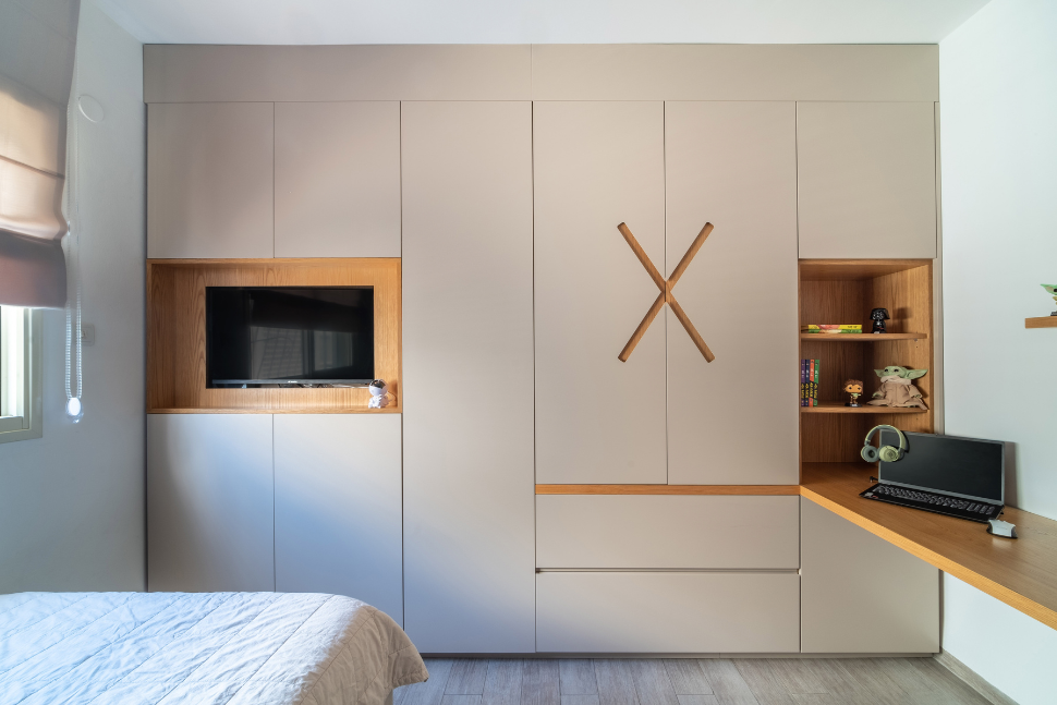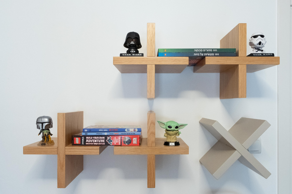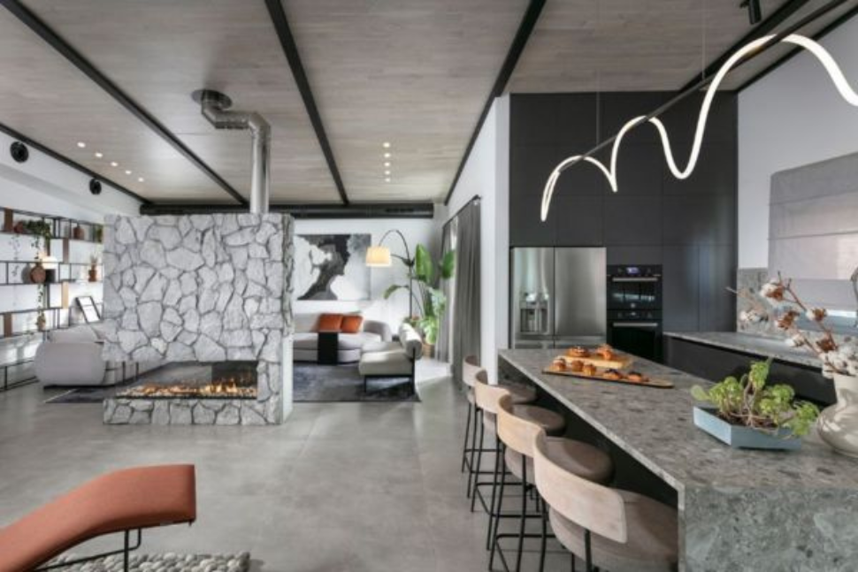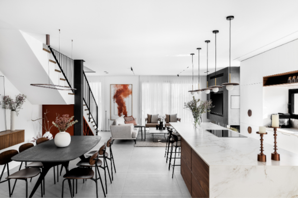 קיר גאומטרי, עשוי כולו מלבנים וריבועים בגדלים שונים, חלקו זה רק קיר וחלק אחר שלו היא חזית ארון אחסון. האם הקיר הוא זה שהכתיב את שוס העיצוב ? לא. גם לא השולחן המבלני המקביל, ואפילו לא גופי התאורה המעוגלים. מה שעשה את המיוחד בפינת האוכל, הוא גרם מדרגות העץ שחוצה בקו אלכסוני את הקיר ומעורר עניין בפינת אוכל אפורה.