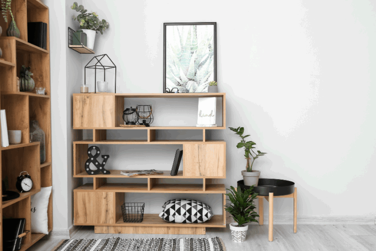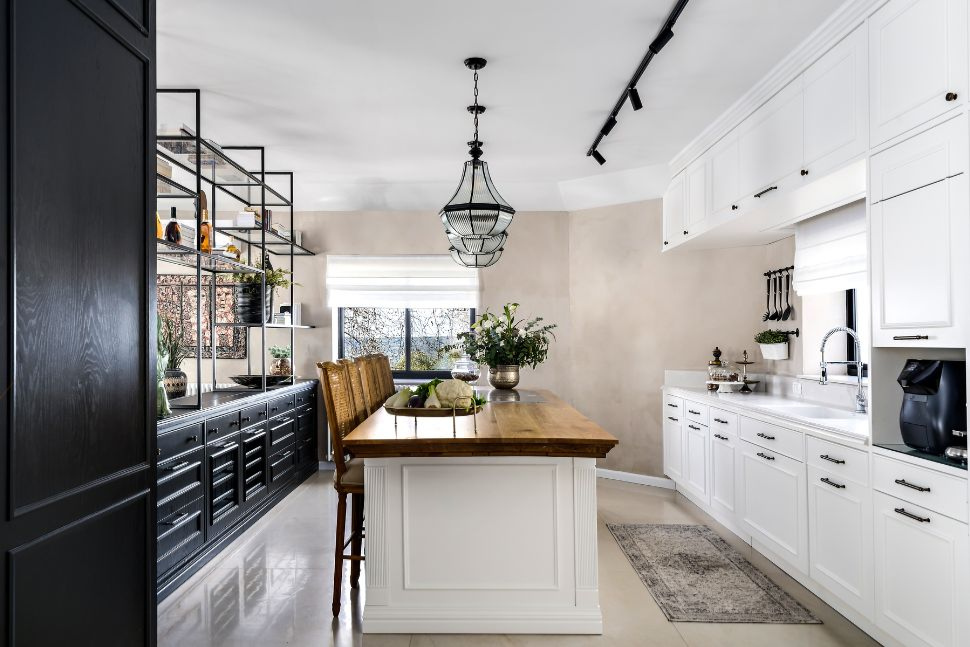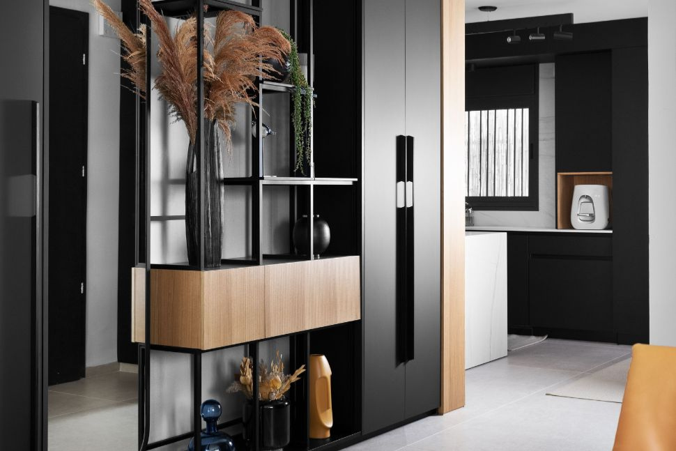 המדפים הפתוחים, בהם יכולים להיות משולבים כדים, בקבוקים וצמחים מיובשים, יכולים להעביר את המסר כבר מהכניסה הביתה. המיוחד במדפים השחורים שעוצבו בכניסה לבית, הוא שהפריטים המשולבים בהם, מתכתבים עם סקלת הצבעים שנבחרה לעיצוב כל הבית.