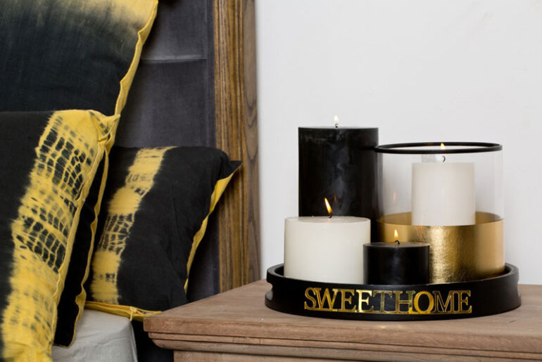 שחור, לבן ומחזיקי נרות עם נגיעות זהב. להשיג ב-contrast, קיבוץ גלויות 49 ת"א. צילום: בועז לביא, סטיילינג: קרן ברק