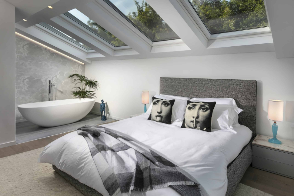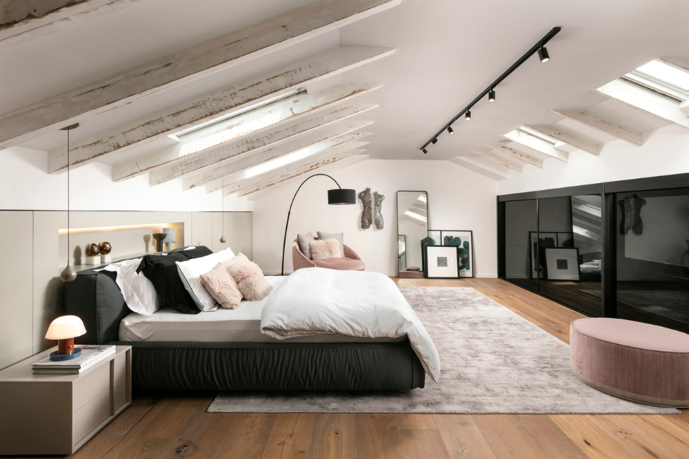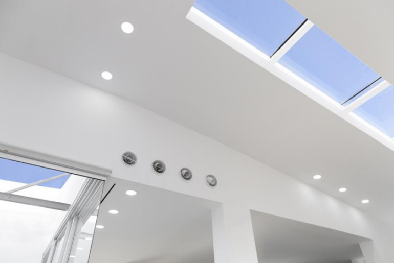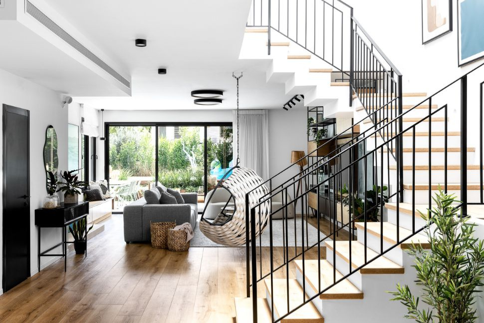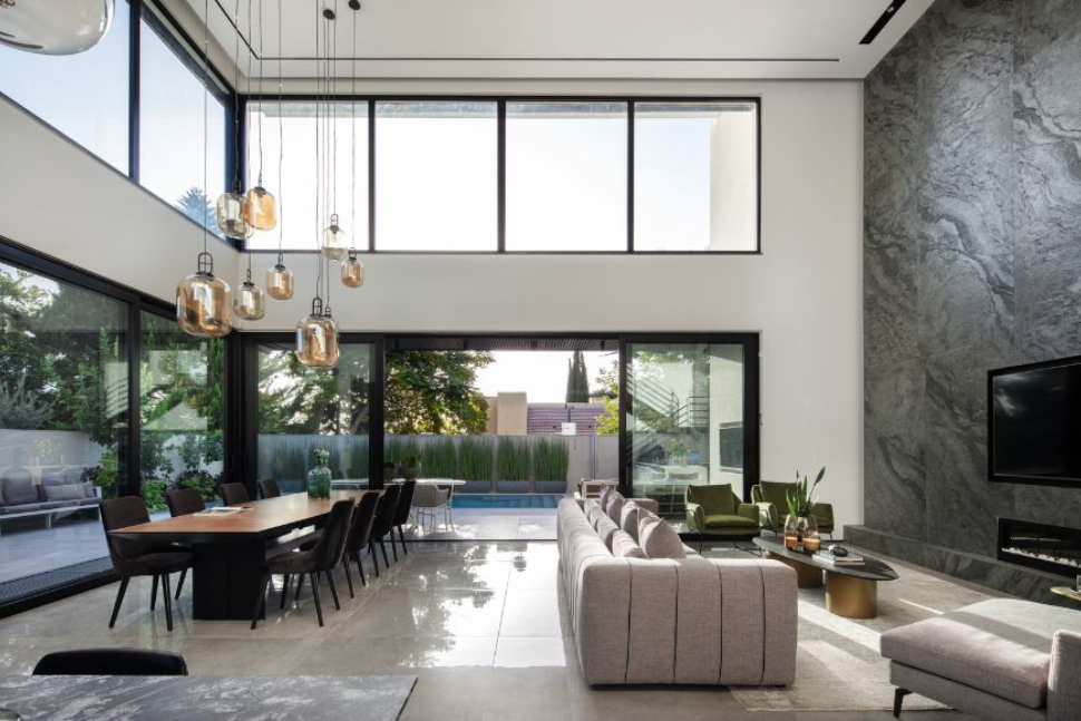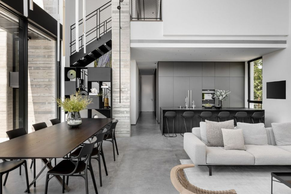 כל המרחב שנועד לבילוי שעות הפנאי ואירוח, כולל פינת אוכל, מטבח וסלון, עוצב תחת גובה אחיד של תקרה בגובה כפול. המדרגות והמרפסת הפנימית מדגישות את גובה התקרה. הפתרון למערכת מזוג האוויר, שלעיתים קרובות ממוקמת מעל תקרה מונמכת, נמצא ברווח שבין רצפת הקומה העליונה והארונות הגבוהים במטבח.