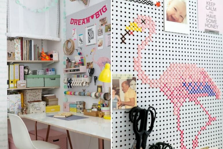 שידת איקאה פשוטה, הממוקמת לצד שולחן האוכל, קיבלה משב רוח רענן בעזרת קיר שנצבע בצבע מגנטי עליו מונחות אותיות. מקבץ מסגרות עם הדפסים צבעוניים, ומנורת לילה בצורת פלמינגו, שנרכשה בחנות פופ בלונדון, משלימים את האווירה ונותנים קריצה שובבה.