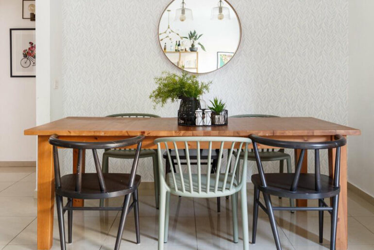 מידן שילבה שולחן איקאה חסר ייחוד מעץ אורן, אבל במידות שהתאימו לתכנון, ושילבה לצידו כיסאות עם מראה ייחודי, כך שהם יקבלו את מרב תשומת הלב. מידן: "גם הכיסאות היו שילוב של יד שנייה עם חדשים והתוצאה מספרת סיפור מעניין על גלגולי נשמות".