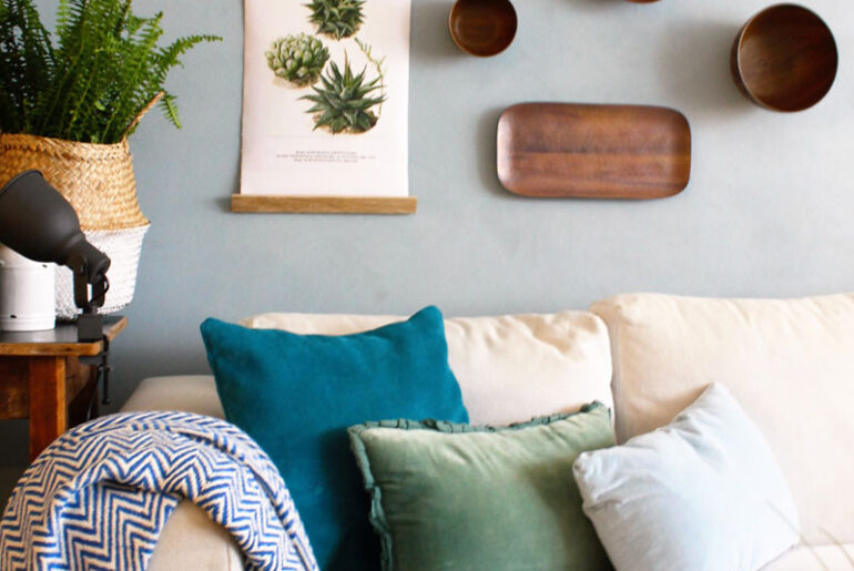 צלחות מקולקציית Zen של Nonna Peppy נבחרו לעטר קיר כתכשיט אמנותי בקומפוזיציה מרעננת. הצלחות, העשויות מלמין ומיוצרות בגרמניה, נתלו עם דבק דו צדדי חזק התומך במשקל צלחת (הגדולה שוקלת 310 גרם). התלייה נעשתה ישירות על גבי הקיר, כשבין שתי שכבות של דבק ניתן להכניס וו תלייה. אופציה פשוטה יותר, המאפשרת גם תחלופה של צלחות מעת לעת, היא תלייה על מסמר באמצעות קפיץ ייעודי לתליית צלחות, שניתן למצוא בחנויות קטנות של כלי בית.
