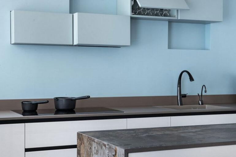 כשהמטבח הופך לחלל המרכזי והמושקע בבית, בוחרים לשלב בעיצובו אלמנטים בולטים ויצירתיים כדוגמת משחקי אשליה בין צורות וממדים. מטבח במראה נקי, דינמי וייחודי בנוי משלושה גושים מרכזיים: החזית הגבוהה מהווה את מרכז המאסה ומשמשת כציר אחסנה, בה מוטמעים גם מוצרי החשמל, כשהחזיתות בגוון לבן-אפרפר. מעל משטח העבודה המצוי בניצב אליו קיר בגוון כחול תכלכל, בו אשליה של קוביות בקומפוזיציה רנדומלית – חלקן שקועות, חלקן בולטות וחלקן במישור הקיר. בשקועות שולבו קלאפות צבועות בתנור בגוון הקיר, המשמשות לאחסון נגיש של צלחות, כוסות וכלי הגשה.
