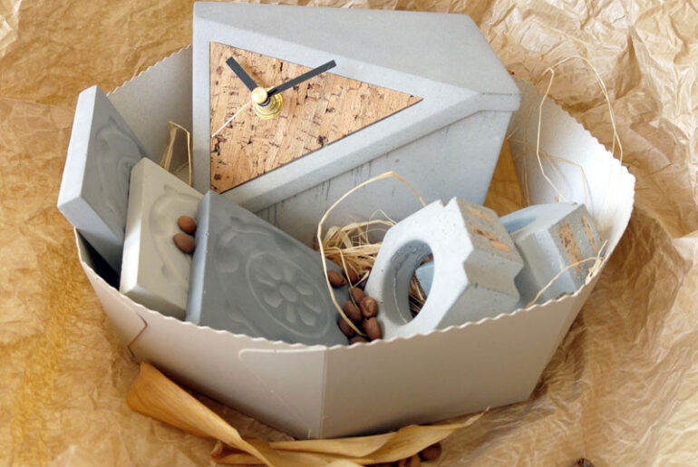 צילומים: אורי ארואסטימה בקופסה: שעון בטון – 480 שקלים, סט 4 תחתיות לכוסות – 70 שקלים, סט 4 חבקי מפיות – 120 שקלים.