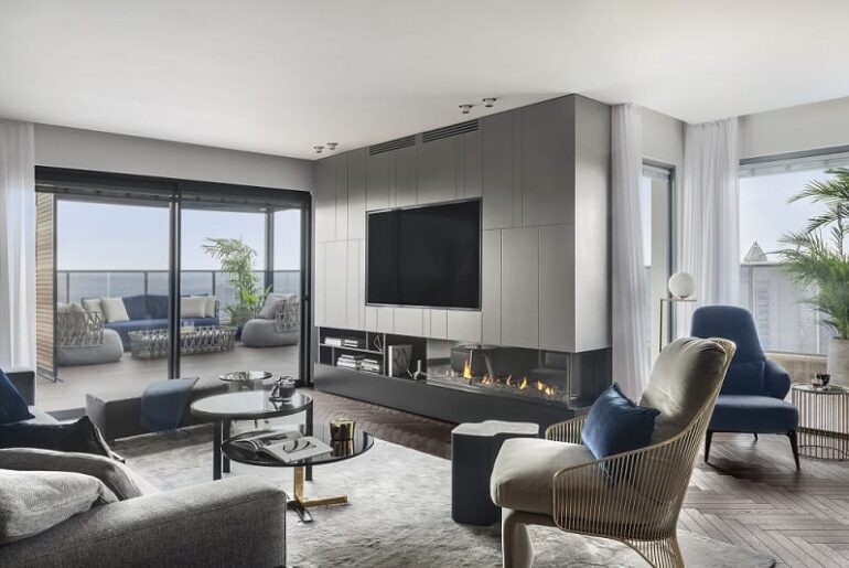 דלתות הזזה חושפות את מסך הטלוויזיה ונסגרות בתום השימוש. עיצוב פנים: מנצ'י מלר. צילום: אלכס-פוטו