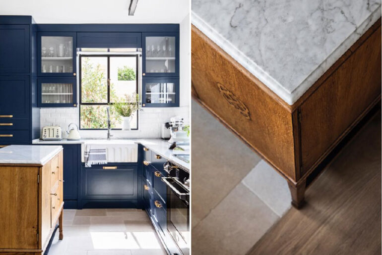 אחת הדרכים הנוחות ביותר לשילוב שיש במראה מהודר ולא יקר היא באמצעות חפצי נוי. בחדר העיצוב אקלקטי, השואב השראה מסגנונות שונים, נבחרה פלטת צבעים רגועה וטבעית עם גוונים שולטים של ירוק מעושן, ורוד פודרה וטונים שונים של אפור. מנורה על מעמד שיש ונר מפרימרק מונחים על שידת הצד ותורמים משלהם לסידור פינה נעימה ושקטה עם טאץ' יוקרתי.