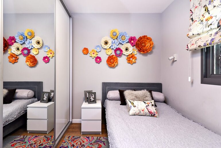 פרחים בחדר של נערה עשויים מנייר וכל פרח מודבר בנפרד לקיר. הצבעים נבחרו כך שיתאימו לשטיח ולווילון הצבעוניים בחדר.