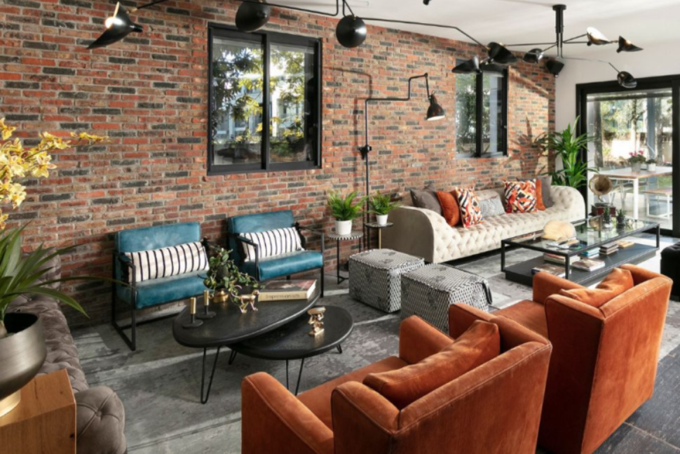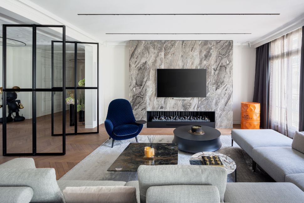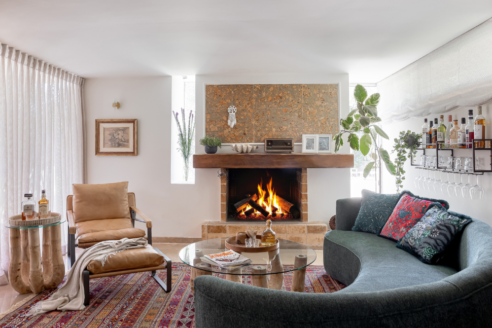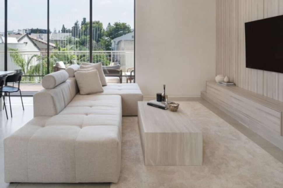 במטרה ליהנות במקסימום מהנוף שחודר פנימה דרך הוויטרינה הגדולה, הספה הועמדה במקביל. אפילו הטלוויזיה שניצבת על עמוד נדחקה הצדה, שלא תפריע. כדי שתחושת המרחב בין הספה לוויטרינה לא תפגע, נבחרו שני שולחנות סלון קטנים, קלים שנוח לנייד אותם לאורך הספה. גם בקושי מרגישים בהם כי גוון העץ מהם הם עשויים זהה לרצפת פרקט העץ. אבל שימו לב, יש כאן הפתעה. ההדום הגדול שאפשר להצמיד אותו לספת השיבה ולהפוך אותה לספת רביצה, יכול להפוך לעוד שולחן עם רק מניחים עליו מגש עם קפה, ארוחה קלה או קערה של פירות ונישנושים.