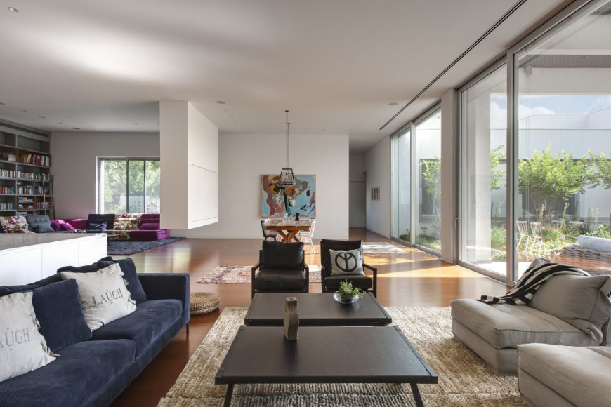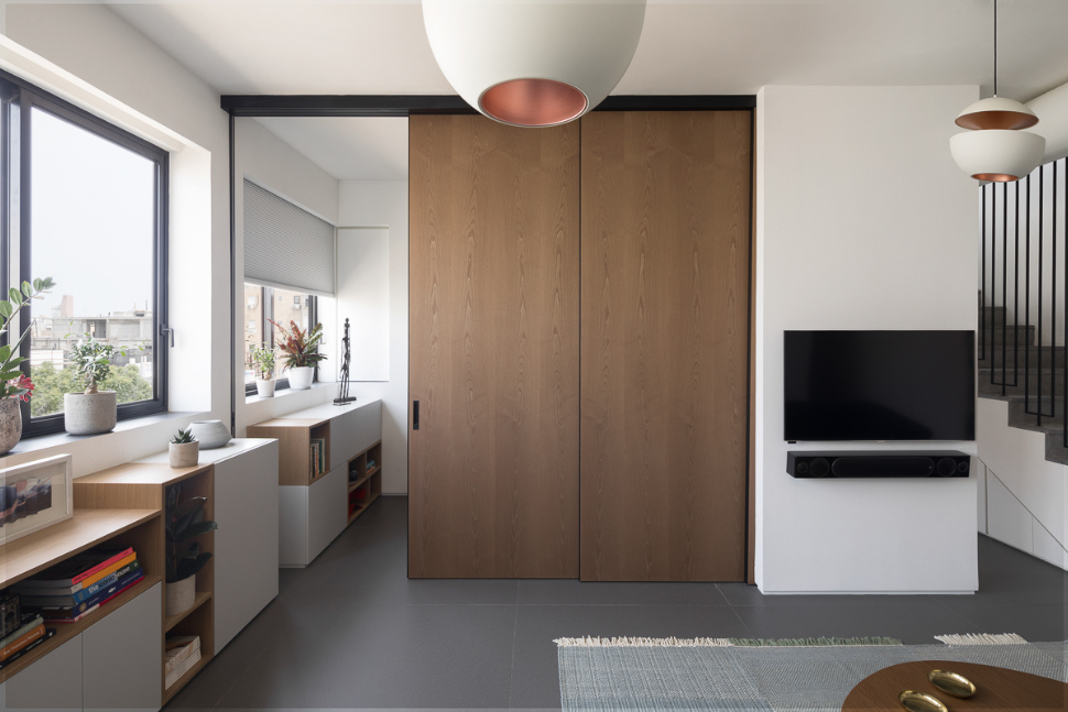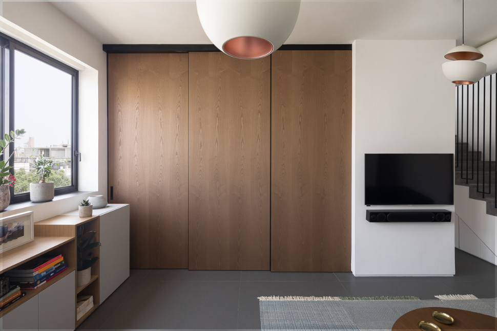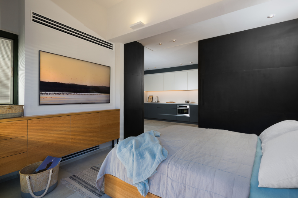 אותו רעיון עיצובי של דלת נסתרת, מיושם בחדר שינה. במסגרת שיפוץ הבית התעורר הצורך של תוספת חדר רחצה הצמוד לחדר השינה של ההורים. הפתרון לכך נמצא בחלוקת החדר לשניים. לאזור השינה הוקצע החלק הגדול יותר, והשאר לחדר הרחצה. ארון הבגדים נבחר להיות החוצץ בין שני האזורים, כאשר אחת מהדלתות שלו למעשה מהווה את הכניסה לחדר הרחצה.