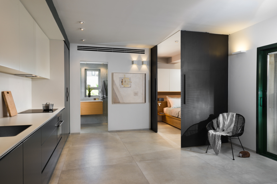 דלת נסתרת לצד המקרר מובילה למטבח נוסף שמשמש גם כמזווה