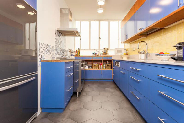 תכנון ועיצוב של מטבח כולל ערב רב של חומרים, החל מרצפה ואריחים ועד שיש, סוג הארונות, החזיתות, הידיות ואביזרי תלייה ודקורציה. מאחר שהאזור מיועד לבישול והכנה, וברוב המקרים שולט בו הברדק, לאותם חומרים יהיו בדרך כלל מאפיינים שקטים ורגועים עם פלטת צבעים עדינה או לכל היותר מתחכמת. הסביבה, שבה מצויה דירת הדופלקס הזו, היוותה השראה לקחת את סך החומרים יותר מצעד אחד קדימה. הדירה ממוקמת קרוב לריחות ולטעמים של השוק בתל אביב ולכן עיצובה הושפע לא רק מטעמם של הדיירים, אלא גם מטעמי השוק. במטבח התערבבו להם יחד אריחי רצפה משושים בצבע אפור בטון, אריחים בצבע לימון, אריחים מעוטרים בצד הנגדי וכאילו זה לא מספיק – גם חזיתות מטבח בצבע כחול עז ומשטחים משני סוגים.