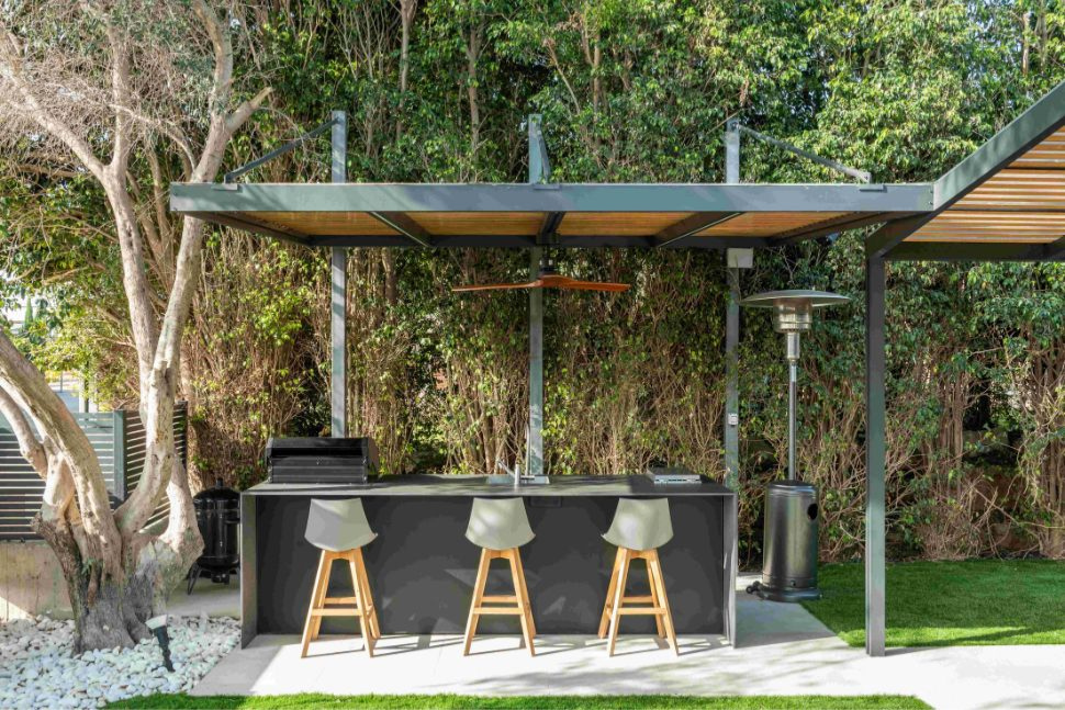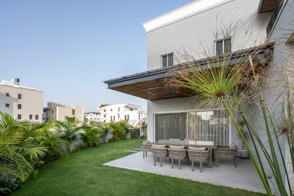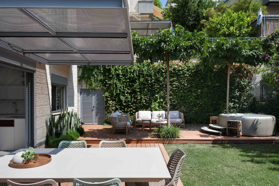מרחב גול חלקו חשוף לשמש וחלקו מוצל מחבר את הבית לבריכה