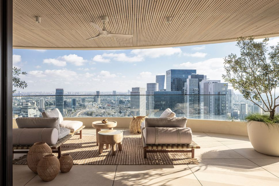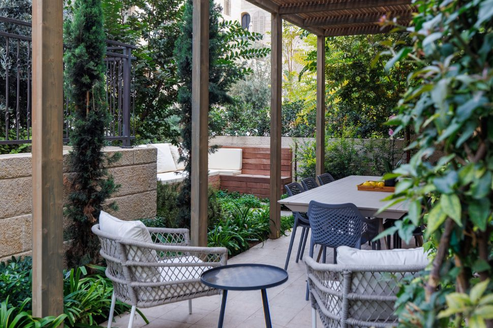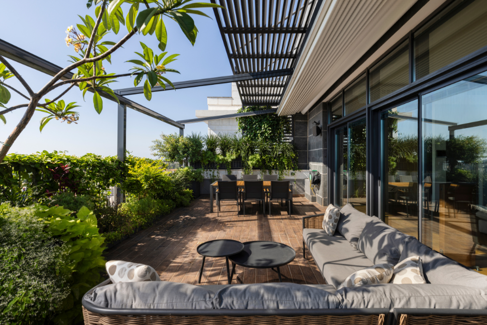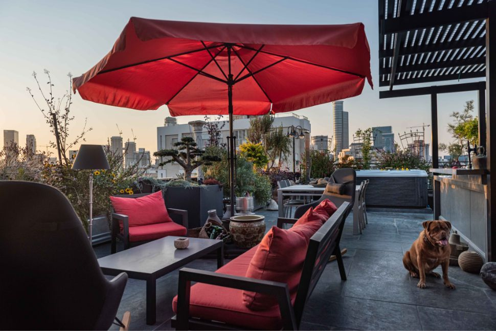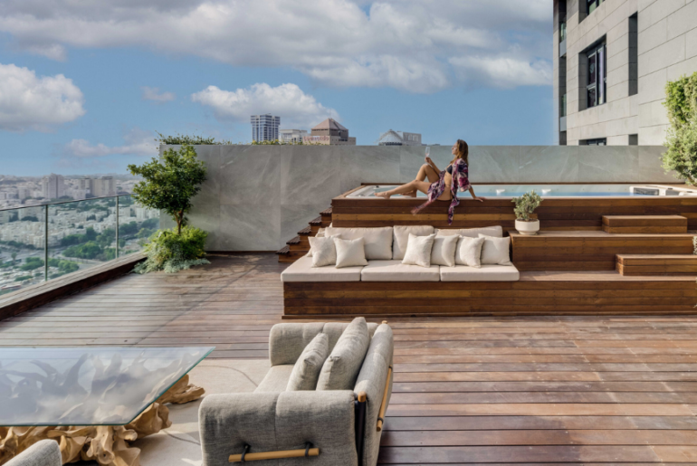 בדירת גג, עיצוב החוץ חולק לשני אזורים. צד אחד של המרפסת שפונה לצד פחות שמשי, הותאם לבילוי בצל. הרצפה חופתה בדשא מלאכותי ומעל עוצבה פרגולה המסתירה את קרני השמש. הצד השמשי יותר, נשאר גלוי עם כיסאות נוח ואלמנט של מים מקרר קצת את האוויר. המלצה: את קרם הבורלה כדאי לאכול בצל ורק אחד כך לצאת לשמש.