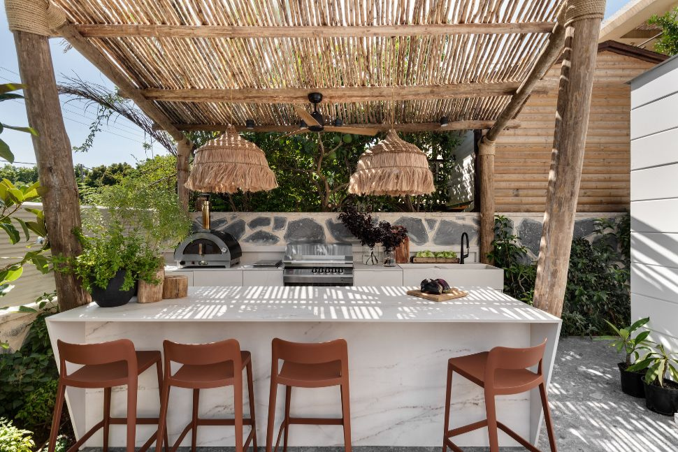 איך שהקיץ נגמר, ומתחילים הגשמים והקור, אנחנו הישראלים כבר מתגעגעים לקיץ, והאמת, גם בחורף כמעט כולם לא מוותרים על השמש, אולי פחות משתזפים אבל נהנים משמש חורפית מחממת, והכיף שלנו שיש לנו לא מעט ימים כאלה. לכן, עיצוב החוץ, החצר או המרפסת נדרש לנו כמו עיצוב פנים הבית. החוץ, משמש את הגרים בבית ובאותה מידה את האורחים. אז קודם כל תסכמו עם עצמכם מה סוג הפעילות שהייתם רוצים לעשות בחוץ, להשתזף, לשבת בצל או שניהם. אספתי לכם כמה דוגמאות של עיצוב חוץ, בבתים ובדירות. בטוח לי שמשהו יתפוס לכם את העין ותגידו לעצמכם כזה אני רוצה. כמו למשל הבית שבתמונה, עם רחבה גדולה צמודה לסלון, חלקה בצל ורובה חשופה לשמש, ובזה לא די, גם המרפסת העליונה שצמודה לחדרי השינה יכולה לשמש כמרחב מתאים לשיזוף וגם לישיבה בצל. לימים שעושים על האש, תוכננה פרגולה נפרדת שמגנה על המטבח החיצוני.