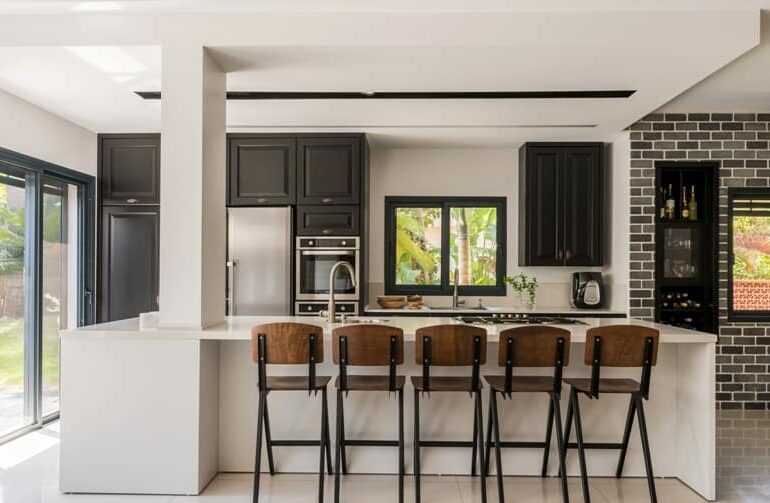 שיש במטבח הוא פריט חובה שצריך לשמש ביעילות. הוא אומנם בעל משטח רחב, אבל דקיקותו מעלימה אותו מהעין ומה שבולט הוא בעיקר מה שמניחים מעליו. במטבח לבן, שכמו נטמע בקיר, בולט משטח Sensa של Cosentino שהוא משטח גרניט אקזוטי ועמיד בפני כתמים שמקורו באבן מברזיל. כל משטח שונה ממשנהו בשל העורקים המיוחדים שנראים עליו.