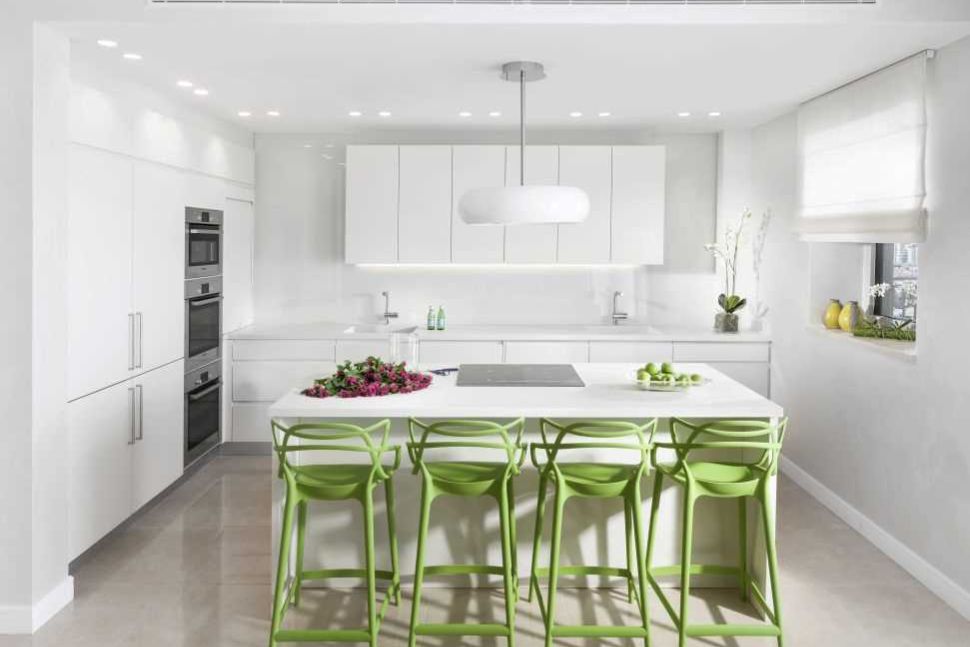 ארבע כיסאות בגוון ירוק מנטה ליד דלפק במטבח לבן