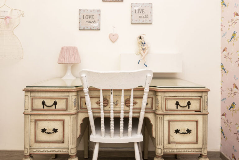שולחן, שנרכש בשוק הפשפשים במחיר מציאה, היה בעל רגליים ומגירות בצבע עץ וידיות נחושת ישנות. המעצבת, שחיפשה לבתה שולחן אחר ומיוחד, צבעה אותו והחליפה ידיות כדי להתאים אותו גם לשלבי ההתבגרות שיבואו. בחדר, שהוא שילוב של ישן וחדש, גם מיטת ברזל זוגית של פעם שסביבה נבנה החדר.