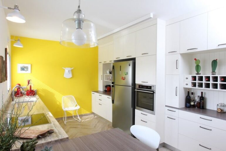 המטבחים הלכו רחוק עם הצבע, אבל יש מי שנשאר נאמן לצבע הנצחי, ורק מתבל אותו בנקודות צבע קלות כדי לא לאבד את המראה הנקי