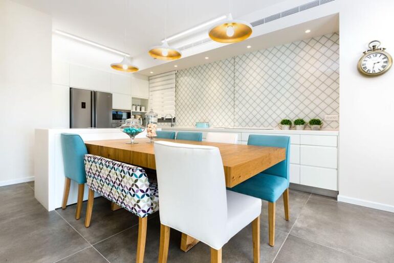מטבח בסגנון מודרני המתבסס על הצבע הלבן הסולידי והנצחי, עוצב לזוג בשנות ה-50 לחייו, והוא גם לא ימהר להחליף אותו בשל הבחירות האלה. את החמימות מעניקות נגיעות העץ והזהב, אבל את השובבות מספק ללא ספק ריפוד הכיסאות, שחורג מהסטנדרט המוצע בתצוגות והוזמן במיוחד, בהתאמה לטעם אישי ולחלל שליד המטבח. ערבוב של דוגמאות וצבעים במושבי הכיסאות, הכורסאות, הידיות יעיד על שני דברים בעיקר: עדכניות וראייה שמחה ושובבה.