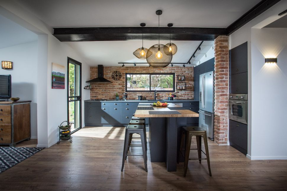 מטבח מודרני פתוח למרחב החברתי בגווני אפור ועץ טבעי