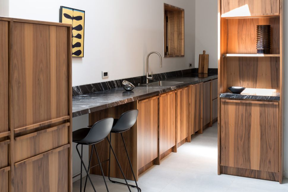 חלל מלבני גדול שפתוח מצד אחד לאזור בילוי שעות הפנאי ומצד שני פונה לחצר, עוצב מרכז קולינרי. משטחי העבודה מוקמו על קיר אחד בתוספת משמעותית בצורת אי גדול, ומצד שני, מכשירי החשמל שולבו בארונות המטבח. במרכז, האי, שעם הזמן הפך לאלמנט מאוד מקובל במטבחים, הותאם הן לעבודה והן לארוחות.