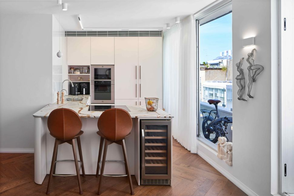 נתחיל מהמטבח שלמעשה הוא חלק בלתי נפרד מהמרחב החברתי שכולל גם סלון ופינת אוכל. עיצבו מתפרש על קיר אחד המקביל לשאר הפונקציות במרחב. אי המשמש לעבודה, ארוחות והרבה מאוד מקומות אחסון יחד עם גופי התאורה התלויים מעליו תוחם את גבולותיו, רצפת הפרקט מהווה רקע אחיד לכל אזור הבילוי ואירוח. גווני האפור בשילוב עץ טבעי שמתכתב עם רצפת הפרקט, מותאמים לפלטת הגוונים בפינת האוכל והסלון. מכשירי החשמל מוסתרים בתוך גומחה גדולה שממשיכה את המטבח