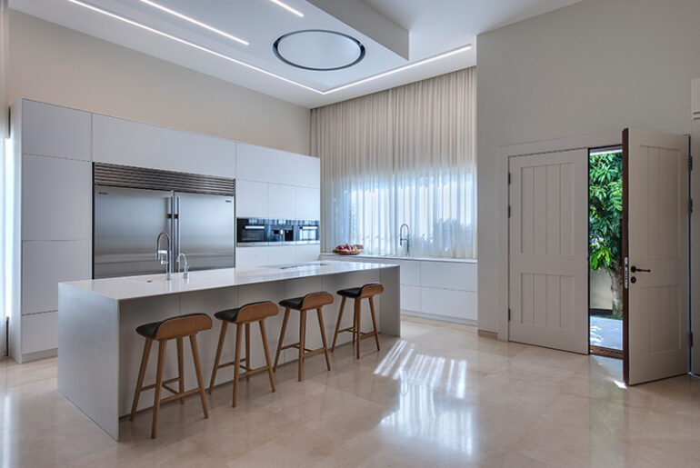 כך, משטח העבודה והכיור במטבח עשויים מיחידה אחת – ללא חיבורים, כשהדלתות ללא ידיות והכל מונע על ידי חשמל. כדי ליצור חלל עבודה פונקציונאלי ונוח במיוחד, הושקעה מחשבה בכל פרט במטבח. כך למשל, המדיח תוכנן בארונות הגבוהים והוגבה ב- 50 סנטימטרים מהרצפה, כך שאין צורך להתכופף בכדי לפנות אותו. הכוסות, הצלחות מוקמו אף הם קרוב למדיח, כדי ליצור חלל נגיש ונוח לעבודה.