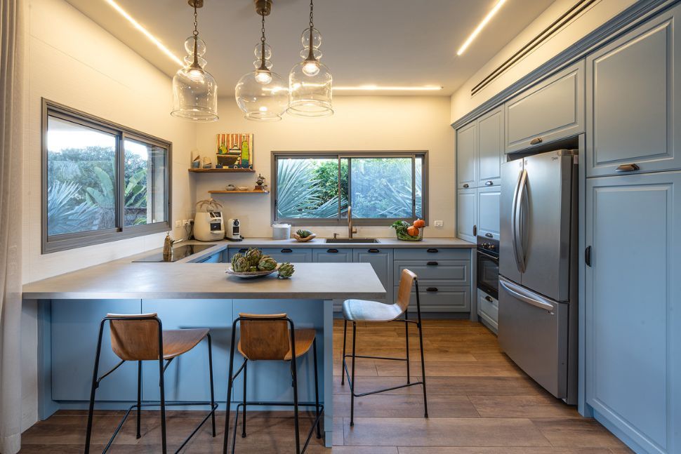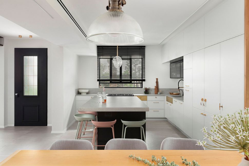 בעיצוב המטבח הזה בולט גובה התקרה, מה שלא מפריע לכך שהוא נראה מטבח בו מבשלים ואופים. שטחו מוגדר באמצעות אי שמחובר לקיר ובו כיריים גז והוא משמש בעיקר כמשטח עבודה. מעליו אלמנט עיצובי תלוי שלקראת הצילום נעשה בו סטיילינג עם כלי קרמיקה קטנים, אבל בדרך כלל הוא יכול לשמש כמקום אחסון לכלי בישול שונים.