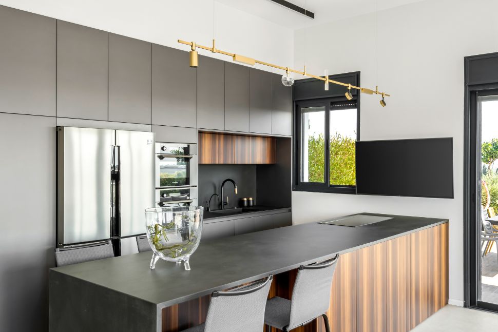 מטבח צמוד לסלון מעוצב בגוונים של אפור גרפיט