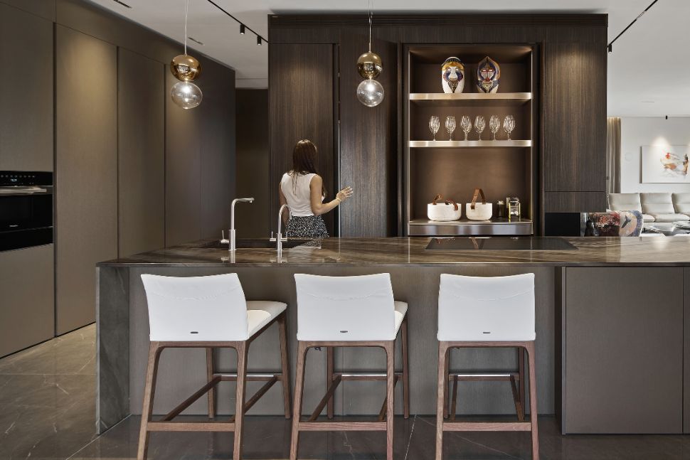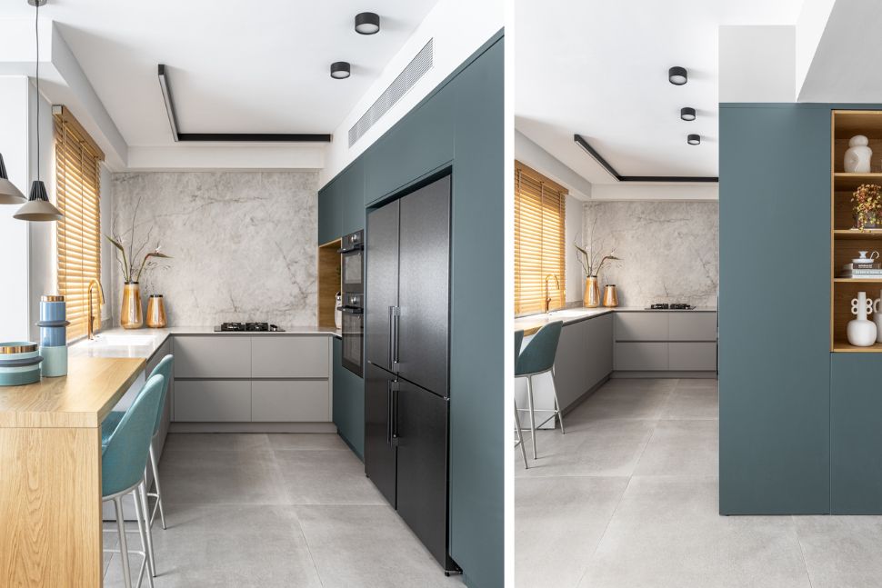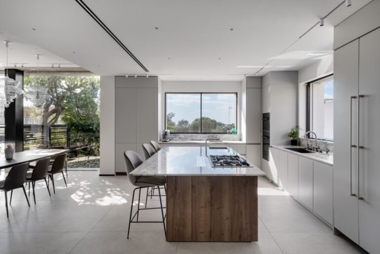 אם פעם בחלוקת התפקידים של המטבח הבישול והאפייה היו העיקר היום הגדרת תפקידו קצת שונתה, עדיין ממשיכים לבשל ולאפות בו. אבל יחד עם זאת הוא הפך לגורם חשוב בעיצוב מרחב הבילוי. מה זה אומר ? שעיצוב מטבח פתוח לסלון חייב להתאים לסגנון החיים של הדיירים. אם הם מבשלים, אופים וגם מבלים המטבח חייב להיות מותאם לעבודה, כלומר- גם יפה וגם אופה. ואם המטבח משמש רק להכנת אוכל בקטנה ובעיקר לפתיחת אריזות משלוחים, הוא יכול להיות רק יפה. נתחיל במטבח שהוא גם וגם. מבחינת המיקום שלו, ברור שהוא חלק מהסלון. מה שמבדיל אותו זה הצבע. אתם שואלים אם מבשלים בו ? אז התשובה היא כן. על כך מוכיחים משטחי העבודה הגדולים, כיריים אינדוקציה וקיר הארונות הגבוהים בהם משולבים תנורים. לגבי מקומות אחסון רבים שדרושים במטבח פעיל, אלה חולקו בין קיר הארונות לבית החלק התחתון של משטחי העבודה והאי.